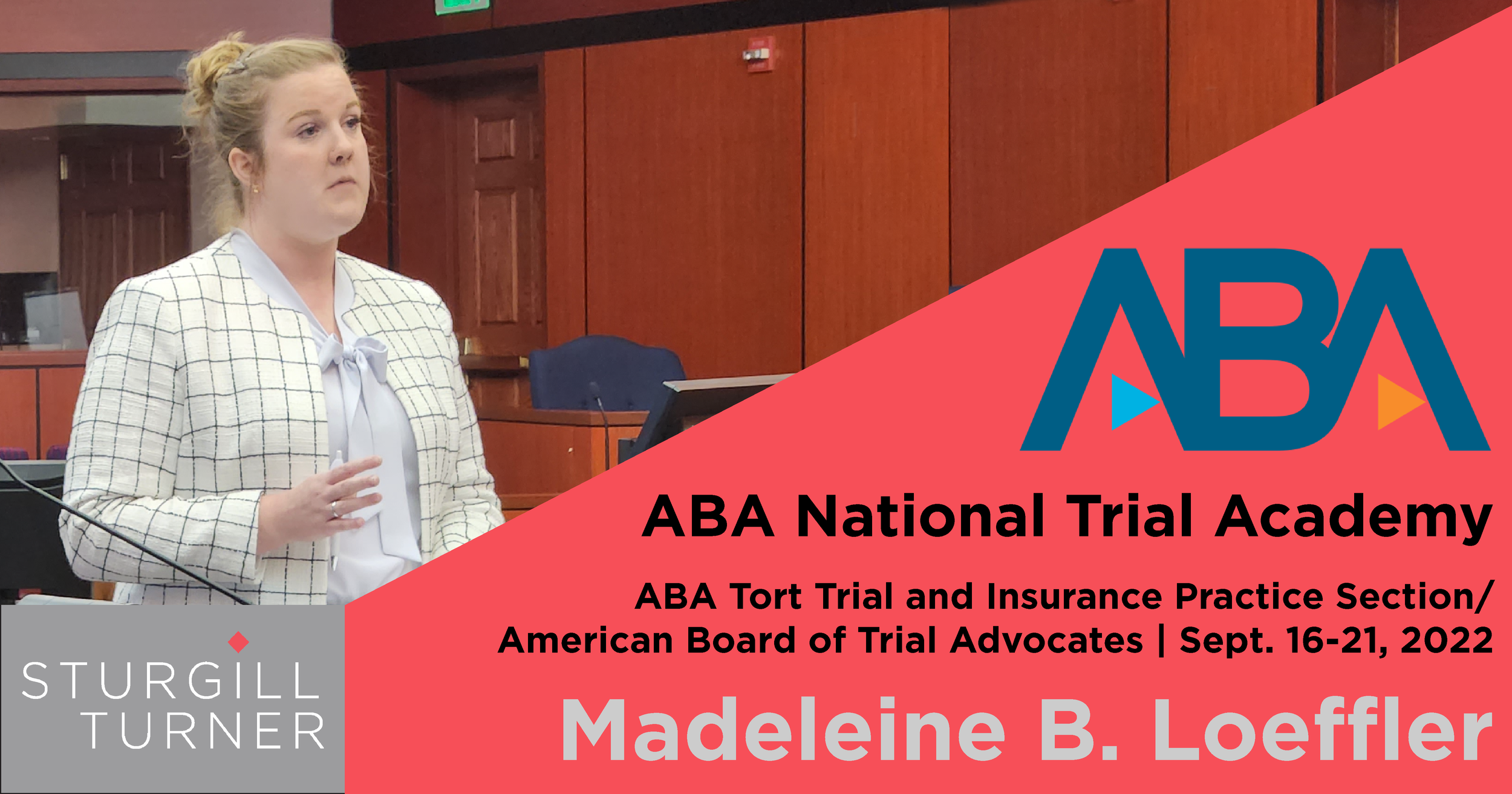 Sturgill Turner healthcare attorney Madeleine Loeffler was one of only 16 students selected nationally to participate in the ABA Tort Trial and Insurance Practice Section (TIPS)/American Board of Trial Advocates (ABOTA) National Trial Academy Sept. 16-21 in Reno, Nev.