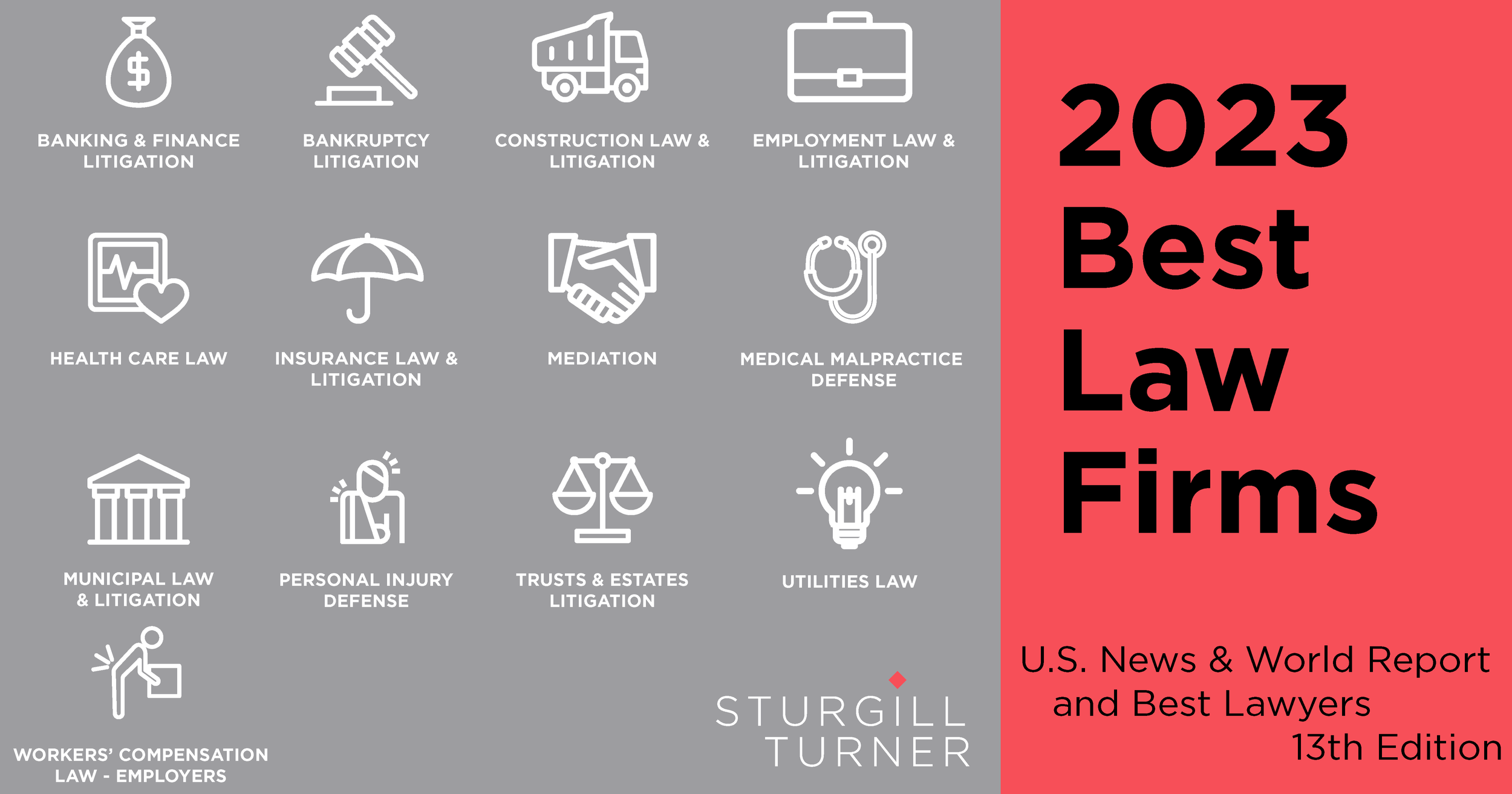 Sturgill Turner has once again earned a spot on the list of the nation’s top law firms as determined by U.S. News – Best Lawyers® in America. In the 13th annual edition of their “Best Law Firms” publication, the firm earned a listing in 21 metropolitan categories.